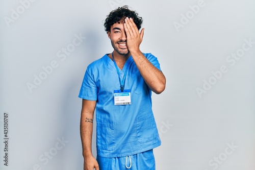 Young hispanic man wearing blue male nurse uniform covering one eye with hand, confident smile on face and surprise emotion.