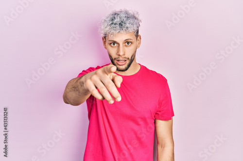 Young hispanic man with modern dyed hair wearing casual pink t shirt pointing displeased and frustrated to the camera, angry and furious with you