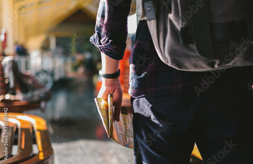 Young man holding map standing on platform at train station for travel. Travel concept by train.