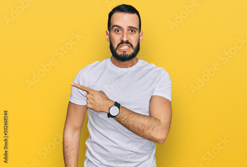 Young man with beard wearing casual white t shirt pointing aside worried and nervous with forefinger, concerned and surprised expression