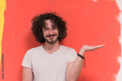 young man with funny hair over color background