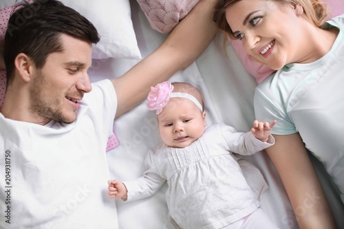 Young parents with baby on bed at home