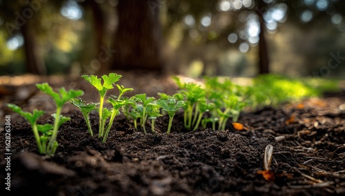 Young plants sprout in dark rich soil. Sunlight filters through trees in the background