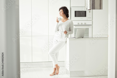 Young real beautiful woman planning expenses and paying bills on her white modern kitchen with laptop.