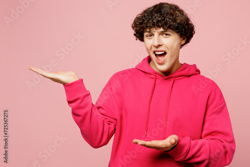 Young smiling Caucasian man wearing hoody casual clothes point hands arms aside indicate on workspace area copy space mock up isolated on plain pastel light pink background studio. Lifestyle concept.