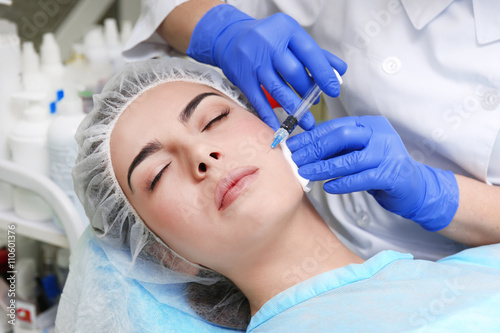 Young woman receiving plastic surgery injection on her face, closeup
