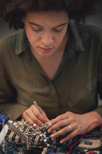 Young woman soldering a circuit boards in her tech office