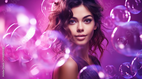 Young Woman with Glowing Bubbles on a Pink Background