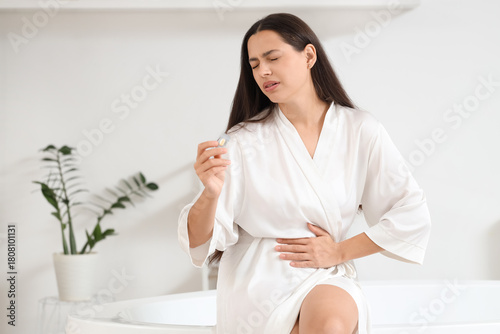Young woman with menstrual cramps and estrogen pill in bathroom