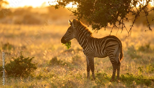 Young Zebra Foal Grazing in Golden Savanna Sunset