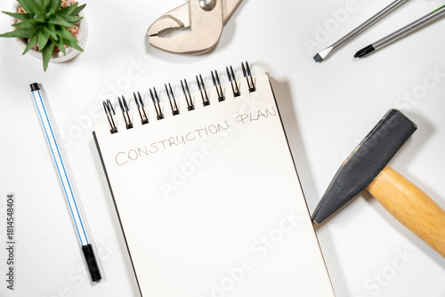 "Construction Plan" handwritten on a notepad surrounded by a hammer, wrench, and screwdrivers. Concept of home renovation, DIY, and contractor work.