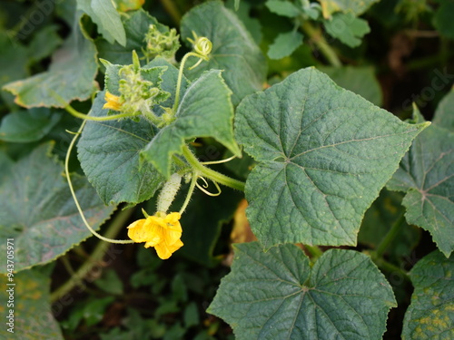 A close-up of a cucumber plant showcasing vibrant yellow flowers and budding fruits, surrounded by lush green leaves. The image captures the essence of growth and natural beauty in a garden setting.