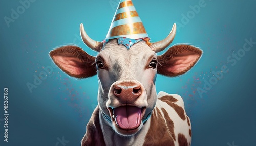 A goofy cartoon cow with a wide grin, wearing a striped party hat tilted to one side, and st