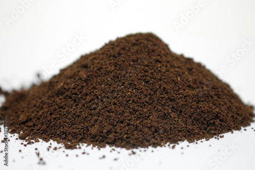 A pile of ground coffee on a white background.