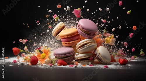 a pile of macaroons and strawberries falling into the air. generative ai