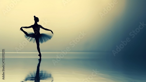 a silhouette of a ballerina in the middle of a body of water with a foggy sky behind her and a reflection of the body of water in the foreground.