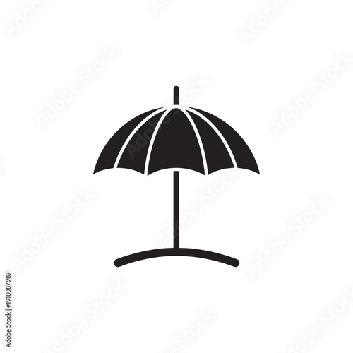 Black silhouette of an open umbrella with a curved stand on a white background, symbolizing protection and cover.