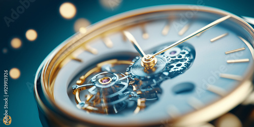 Closeup of luxury watch movement with intricate gears and jewels on blue background, showcasing precision engineering and craftsmanship for horology enthusiasts or timepiece collectors