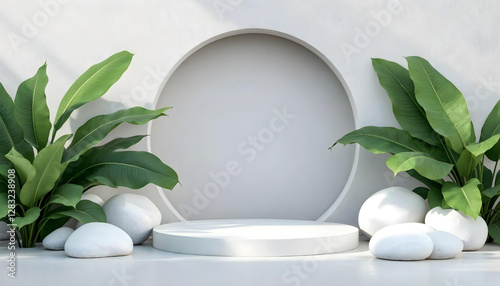 lush green tropical leaves podium background beauty cosmetics sale