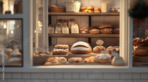 Rustic bakery window display with assorted breads and pastries, cozy ambiance.