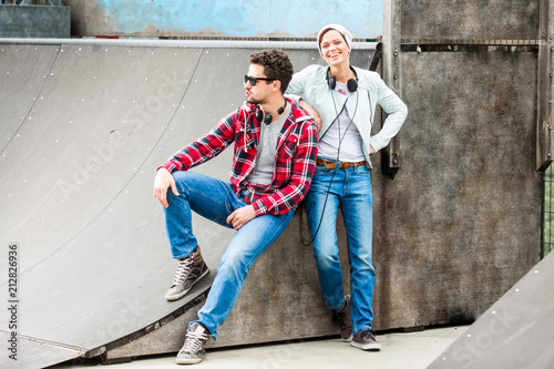 young couple listening to music in a skate park