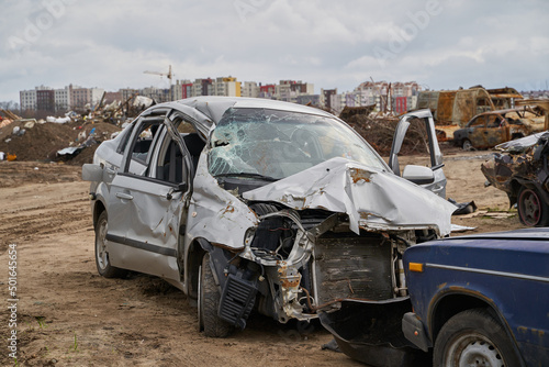 2022 Russian invasion of Ukraine war. War ruins city damage car. Terror attack bomb shell of civilian bombed. Disaster area. cars beaten by shrapnel and burnt
