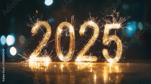 2025 written with sparklers, creating festive and vibrant atmosphere at night. bright lights and sparkles add celebratory touch to scene