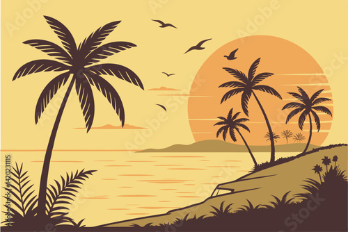 22 Tropical sunset, palm trees silhouette, golden sky, orange sun, calm ocean, birds flying, beach landscape, warm tones, serene atmosphere, vector art style, symmetrical composition, peaceful scene,