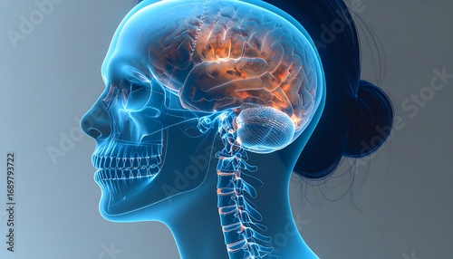 3D anatomical illustration of a female head, highlighting the brain and spinal cord
