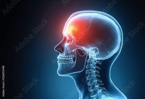 3D rendered illustration of head X-ray with glowing pain in brain