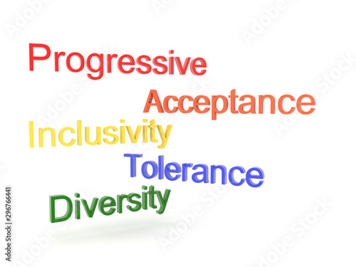 3D Texts saying progressive, acceptance, tolerance, inclusivity and diversity