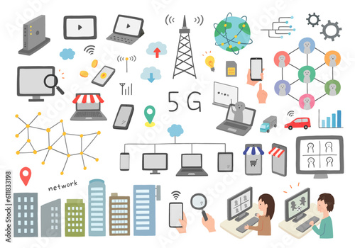 5G・ネットにまつわる手描きイラストセット(カラー/輪郭線なし)