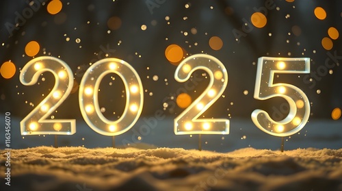 A 2025 New Year celebration background in natural earth tones and glowing bioluminescent colors, featuring illuminated numbers, falling snow, natural light effects, a vibrant glow, browns, and beiges