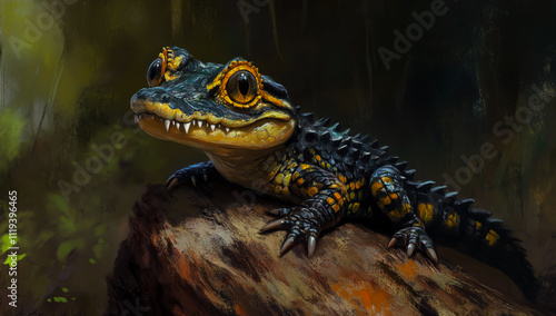 A baby crocodile with its head tilted to the side, sitting on top of a tree trunk in nature