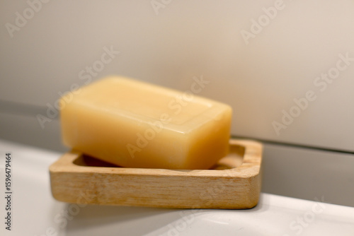 A bar of gray soap on the edge of the sink, hygiene.