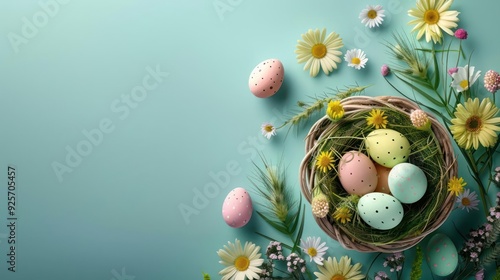 A basket filled with Easter eggs, surrounded by a beautiful garden of flowers.