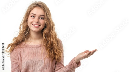 A beautiful young woman stands and smiles brightly. He held out his hand and opened it.