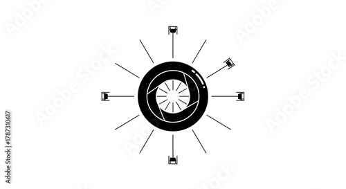 A black and white graphic with a circular aperture surrounded by lights and radiating lines design