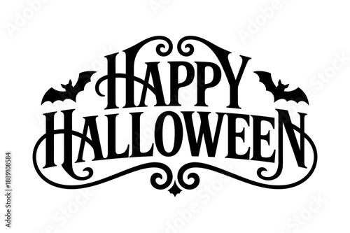 A black and white Halloween vector graphic with bats and swirls