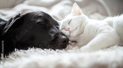 A black dog and a white cat are sleeping together on a bed