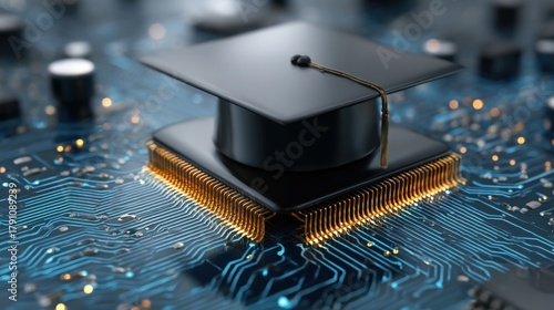 A black graduation cap is on top of a computer chip. Concept of accomplishment and achievement, as the cap is a symbol of academic success