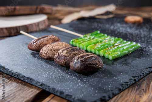 A black slate plate with grilled mushrooms and asparagus skewers sprinkled with seasoning.