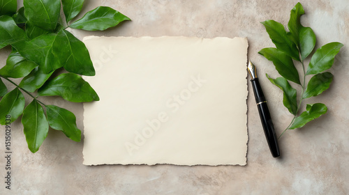A blank parchment paper surrounded by green leaves and a fountain pen, ideal for stationery or nature-themed designs.