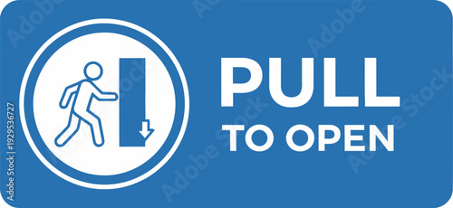A blue sign with a white icon showing a person pulling a door and text "PULL TO OPEN" indicating how to operate the door.