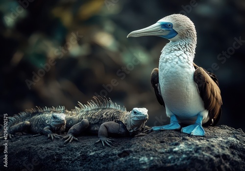 A Blue-Footed Booby and Iguanas Resting on a Rocky Shore in a Tropical Environment Captured in a Stunning Nature Scene