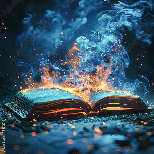 A book is on fire and the flames are blue. The book is open to a page with the word fire on it. The scene is dramatic and intense, with the fire and smoke creating a sense of danger and urgency