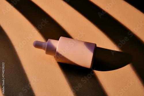 A bottle of serum on a beige background with stripes of shadows.