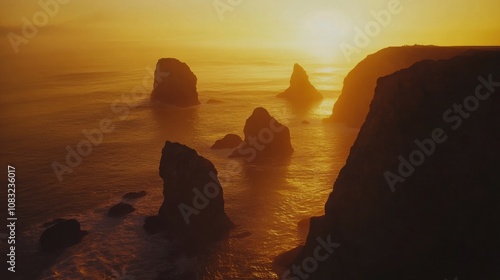A breathtaking aerial perspective of the rugged coastline and sea stacks along the Oregon Coast at sunrise, Oregon sea stacks scene, Cinematic style