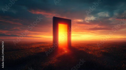 A bright door stands open in the middle of an empty field, with a sunrise and a foggy background