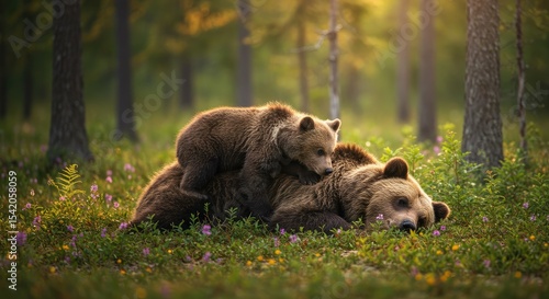 A brown bear mother and cub in a forest glade. Sunlight filters through trees